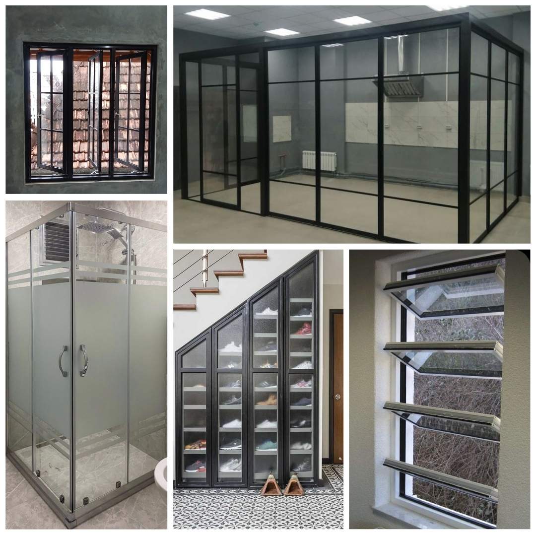 Produk Kaca seperti curtain wall, partisi kaca, pintu kaca frameless, shower screen, hingga pintu kaca kamar mandi.