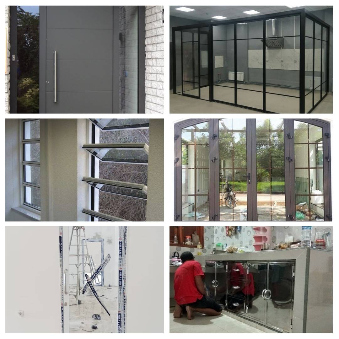 - Pintu aluminium geser, pintu aluminium ayun, pintu lipat aluminium, pintu kamar mandi aluminium, pintu panel ACP, pintu aluminium spandril, hingga pintu geser lipat aluminium.