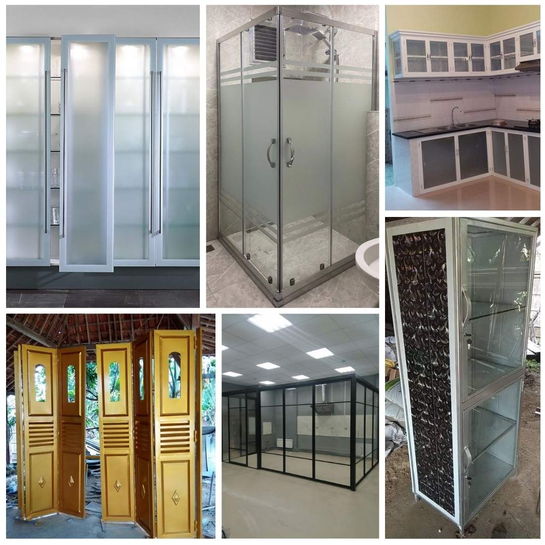 - Pintu aluminium geser, pintu aluminium ayun, pintu lipat aluminium, pintu kamar mandi aluminium, dan pintu panel ACP.