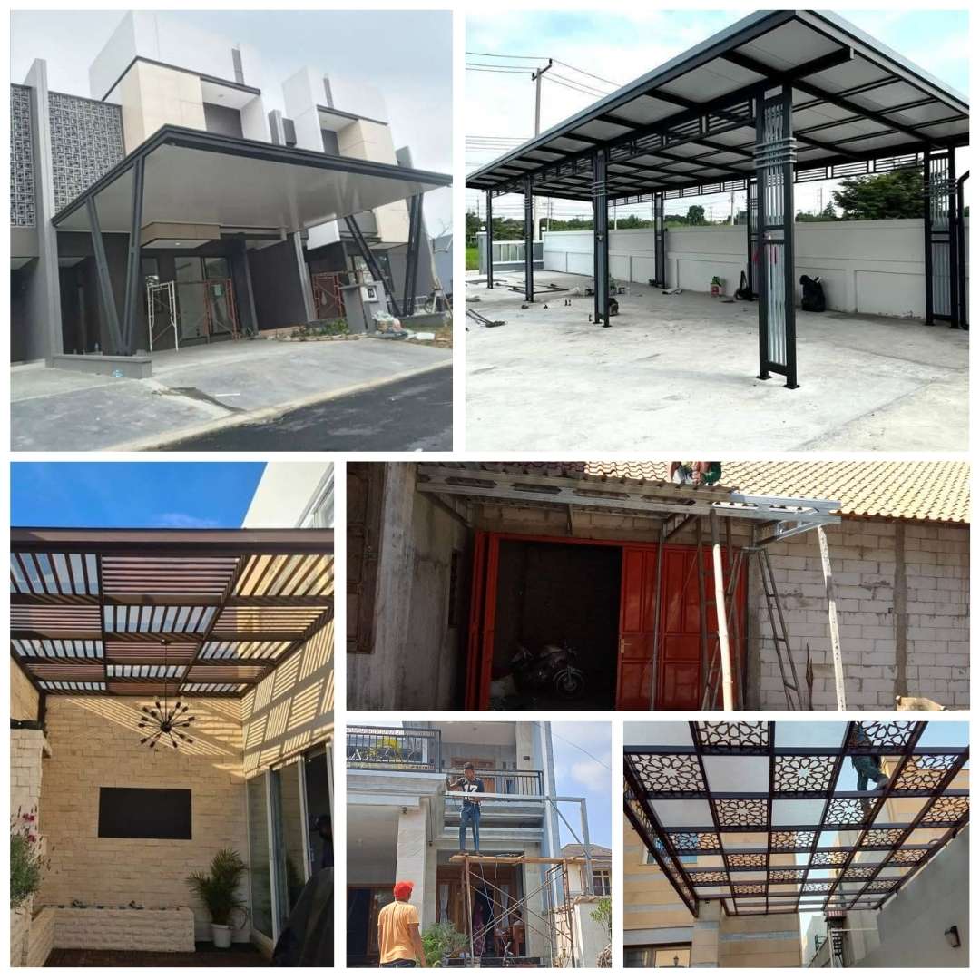 Model ini sangat populer karena tampilannya simpel, bersih, dan rapi. Menggunakan kombinasi baja ringan atau besi holo dengan atap spandek atau polycarbonate, desain minimalis memberi kesan modern tanpa berlebihan. -