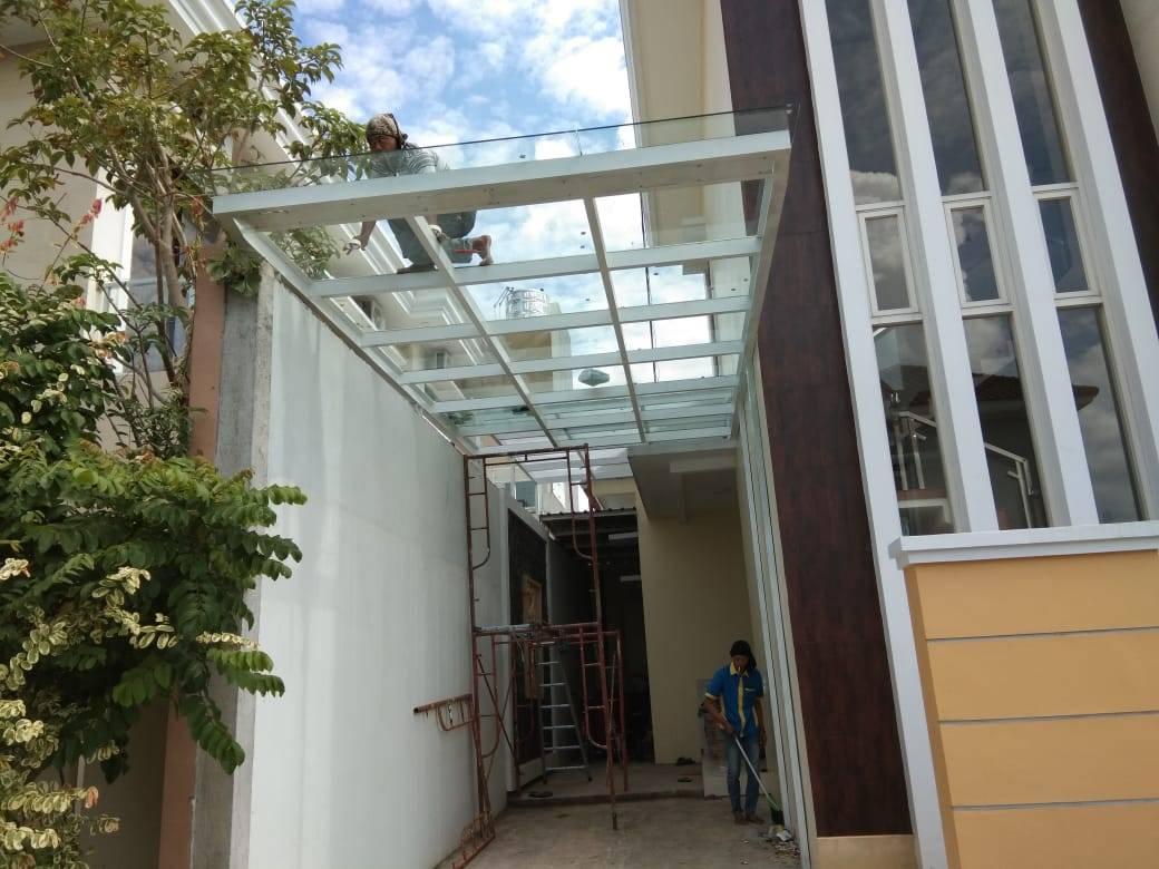 Kanopi kaca memberikan kesan modern dan mewah. Material kaca tempered yang kuat mampu menahan panas dan hujan, sekaligus memberi cahaya alami lebih maksimal, kanopi kaca tempered elegan untuk teras rumah modern.